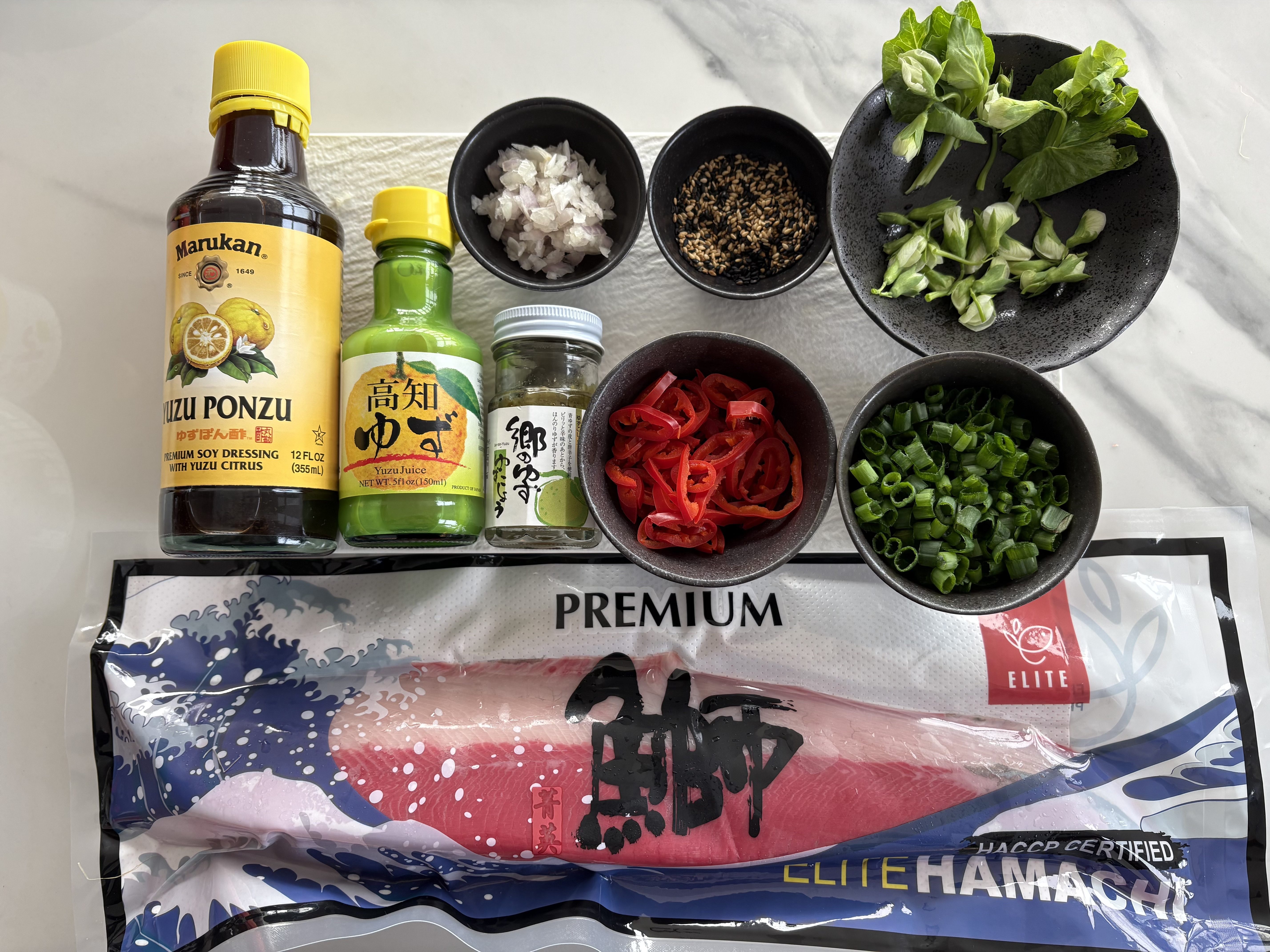 - 200g fresh hamachi (sashimi-grade), thinly sliced