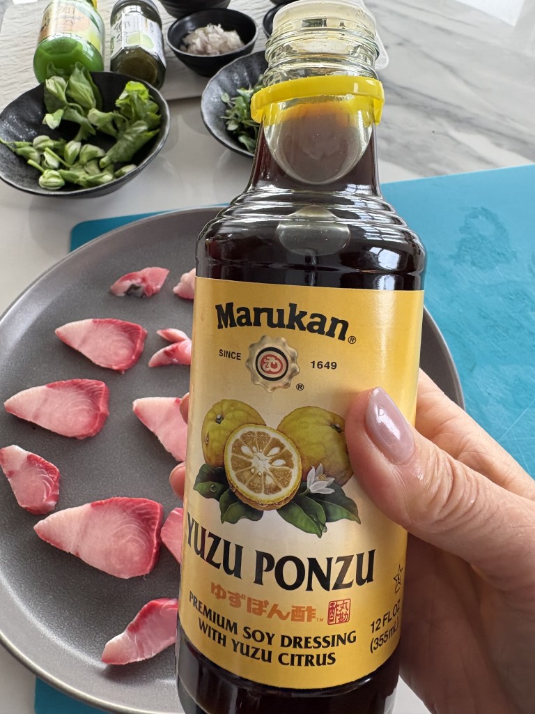 - In a small bowl, mix the Ponzu/soy sauce, yuzu juice, sesame oil