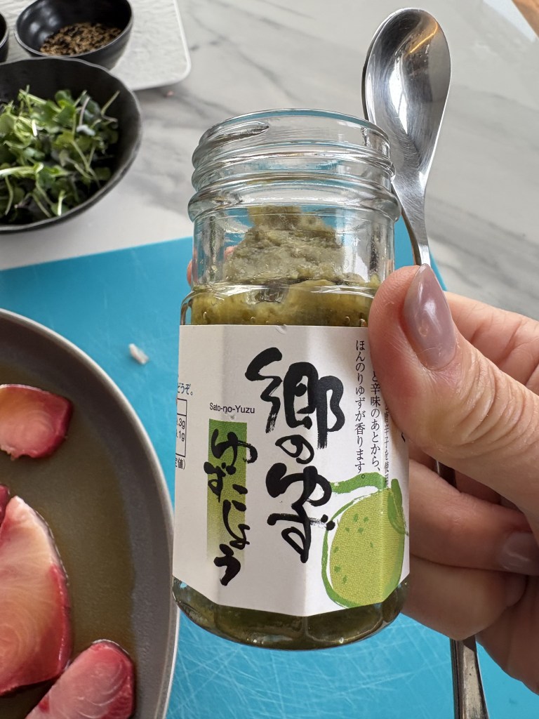 - Place a small dab of Yuzu Kosho on each piece of Hamachi and dab a few decoratively on the plate